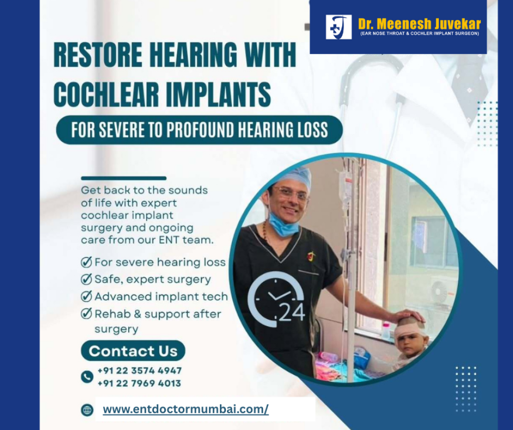 Seeking expert cochlear implant surgery in Maharashtra, India? Dr. Meenesh Juvekar, a renowned ENT specialist with 20+ years of experience, offers advanced cochlear implant procedures for children and adults. Enjoy personalized care, modern technology, and proven results at Juvekars Nursing Home, Bombay Hospital & Fortis Hospitals.