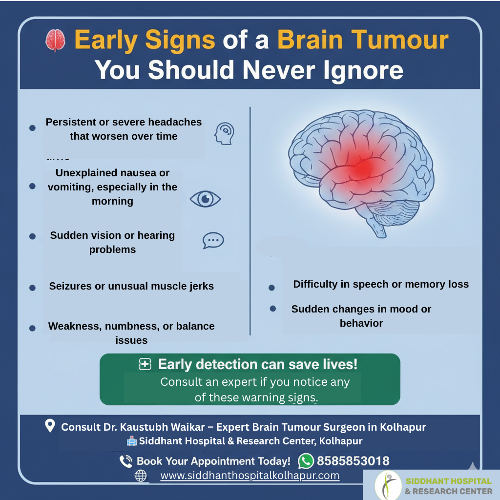 Experiencing persistent headaches, nausea, blurred vision, or memory issues? Consult Dr. Kaustubh Waikar, expert Brain Tumour Surgeon in Kolhapur at Siddhant Hospital & Research Center. Advanced MRI, CT scans, and neurosurgical care available for accurate diagnosis and safe treatment.