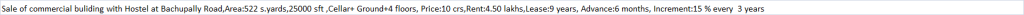| Sale of commercial buliding with Hostel at Bachupally Road,Area:522 s.yards,25000 sft ,Cellar+ Ground+4 floors, Price:10 crs,Rent:4.50 lakhs,Lease:9 years, Advance:6 months, Increment:15 % every 3 years |