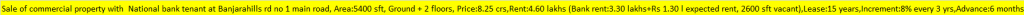 | Sale of commercial property with National bank tenant at Banjarahills rd no 1 main road, Area:5400 sft, Ground + 2 floors, Price:8.25 crs,Rent:4.60 lakhs (Bank rent:3.30 lakhs+Rs 1.30 l expected rent, 2600 sft vacant),Lease:15 years,Increment:8% every 3 yrs,Advance:6 months,UDS:200 S.YARDS. |