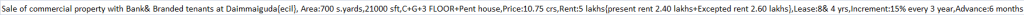 | Sale of commercial property with Bank& Branded tenants at Daimmaiguda{ecil}, Area:700 s.yards,21000 sft,C+G+3 FLOOR+Pent house,Price:10.75 crs,Rent:5 lakhs{present rent 2.40 lakhs+Excepted rent 2.60 lakhs},Lease:8& 4 yrs,Increment:15% every 3 year,Advance:6 months. |
