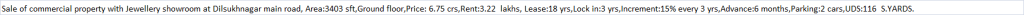 | Sale of commercial property with Jewellery showroom at Dilsukhnagar main road, Area:3403 sft,Ground floor,Price: 6.75 crs,Rent:3.22 lakhs, Lease:18 yrs,Lock in:3 yrs,Increment:15% every 3 yrs,Advance:6 months,Parking:2 cars,UDS:116 S.YARDS. |