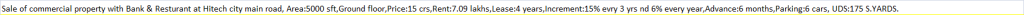 | Sale of commercial property with Bank & Resturant at Hitech city main road, Area:5000 sft,Ground floor,Price:15 crs,Rent:7.09 lakhs,Lease:4 years,Increment:15% evry 3 yrs nd 6% every year,Advance:6 months,Parking:6 cars, UDS:175 S.YARDS. |