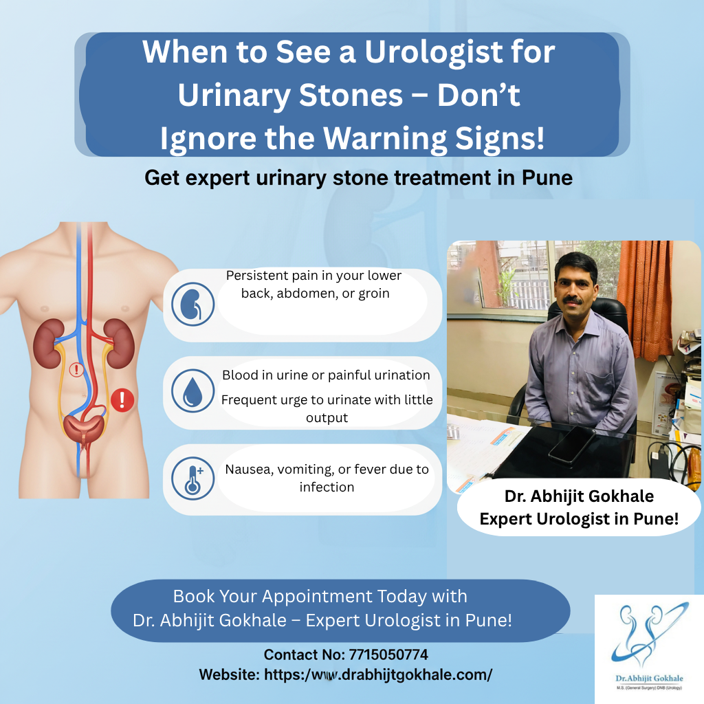 Experiencing severe back pain, burning while urinating, or blood in your urine? These could be signs of urinary stones that need immediate expert care. Get accurate diagnosis and effective urinary stone treatment in Pune from Dr. Abhijit Gokhale, a trusted Urologist with years of experience in advanced and minimally invasive procedures.