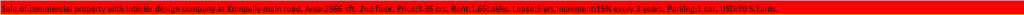 | Sale of commercial property with Interior design company at Kompally main road, Area:2566 sft, 2nd floor, Price:3.35 crs, Rent:1.65Lakhs, Lease:9 yrs,Increment:15% every 3 years, Parking:1 car, USD:70 S.Yards. |