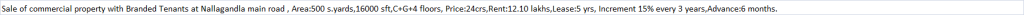 | Sale of commercial property with Branded Tenants at Nallagandla main road , Area:500 s.yards,16000 sft,C+G+4 floors, Price:24crs,Rent:12.10 lakhs,Lease:5 yrs, Increment 15% every 3 years,Advance:6 months. |