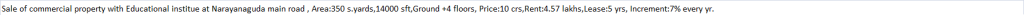 | Sale of commercial property with Educational institue at Narayanaguda main road , Area:350 s.yards,14000 sft,Ground +4 floors, Price:10 crs,Rent:4.57 lakhs,Lease:5 yrs, Increment:7% every yr. |