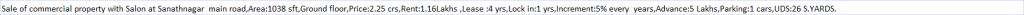 | Sale of commercial property with Salon at Sanathnagar main road,Area:1038 sft,Ground floor,Price:2.25 crs,Rent:1.16Lakhs ,Lease :4 yrs,Lock in:1 yrs,Increment:5% every years,Advance:5 Lakhs,Parking:1 cars,UDS:26 S.YARDS. |