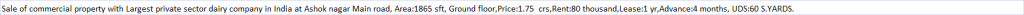 | Sale of commercial property with Largest private sector dairy company in India at Ashok nagar Main road, Area:1865 sft, Ground floor,Price:1.75 crs,Rent:80 thousand,Lease:1 yr,Advance:4 months, UDS:60 S.YARDS. |
