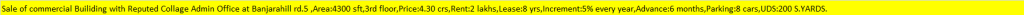 Sale of commercial Builiding with Reputed Collage Admin Office at Banjarahill rd.5 ,Area:4300 sft,3rd floor,Price:4.30 crs,Rent:2 lakhs,Lease:8 yrs,Increment:5% every year,Advance:6 months,Parking:8 cars,UDS:200 S.YARDS.