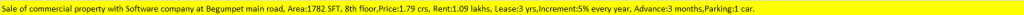Sale of commercial property with Software company at Begumpet main road, Area:1782 SFT, 8th floor,Price:1.79 crs, Rent:1.09 lakhs, Lease:3 yrs,Increment:5% every year, Advance:3 months,Parking:1 car.