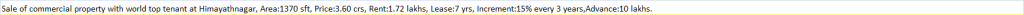 | Sale of commercial property with world top tenant at Himayathnagar, Area:1370 sft, Price:3.60 crs, Rent:1.72 lakhs, Lease:7 yrs, Increment:15% every 3 years,Advance:10 lakhs. |