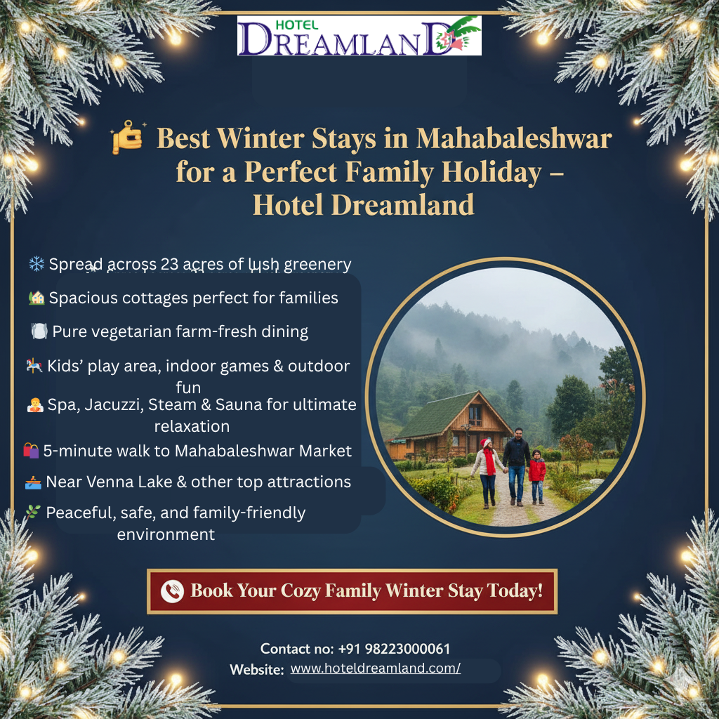 Planning a cozy and memorable stay in Mahabaleshwar this winter with your family? Hotel Dreamland offers spacious cottage-style rooms, pure vegetarian farm-fresh meals, a kids’ play area, indoor & outdoor games, spa facilities, and a serene 23-acre green campus. With easy access to Mahabaleshwar Market and major attractions, it’s the perfect destination for comfort, convenience, and family fun.