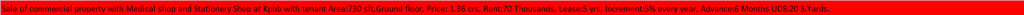 | Sale of commercial property with Medical shop and Stationery Shop at Kphb with tenant Area:730 sft,Ground floor, Price: 1.36 crs, Rent:70 Thousands, Lease:5 yrs, Increment:5% every year, Advance:6 Months UDS:20 S.Yards. |