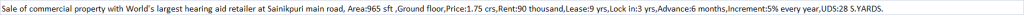 | Sale of commercial property with World's largest hearing aid retailer at Sainikpuri main road, Area:965 sft ,Ground floor,Price:1.75 crs,Rent:90 thousand,Lease:9 yrs,Lock in:3 yrs,Advance:6 months,Increment:5% every year,UDS:28 S.YARDS. |